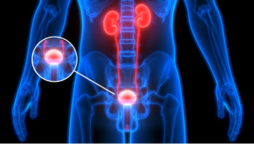 En un aula de clase de ciencias, el profesor les explica a sus estudiantes acerca del cuerpo humano, toma un modelo anatómico del sistema urinario y les señala donde está la uretra.