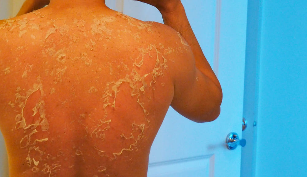 Una mujer que se expone al sol varias horas en una piscina. Luego inicia con quemadura solar en el cuerpo, caracterizada por enrojecimiento, calor y dolor tipo ardor. Decide comprar una crema para aplicarse en la piel.